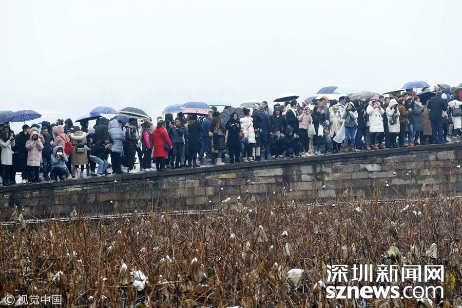 深圳新聞網(wǎng)訊 2018年12月8日,杭州,當(dāng)日市區(qū)普降大雪,市民和游客扎堆涌入西湖景區(qū),拍攝最美雪景照片以及為自己留影。每次杭州一下雪,斷橋便成為眾多游客欣賞雪景、拍攝雪景的地方,大家都想看看“斷橋殘雪”。游客們?cè)延咳霐鄻蚝?,人山人海,讓現(xiàn)場(chǎng)堪比春運(yùn)場(chǎng)景。因?yàn)槿颂?,雪積不起來,斷橋看不到殘雪。