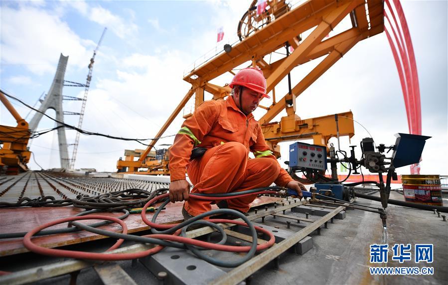 11月3日,工人在進(jìn)行大橋合龍收尾工作。 新華社記者 郭程 攝