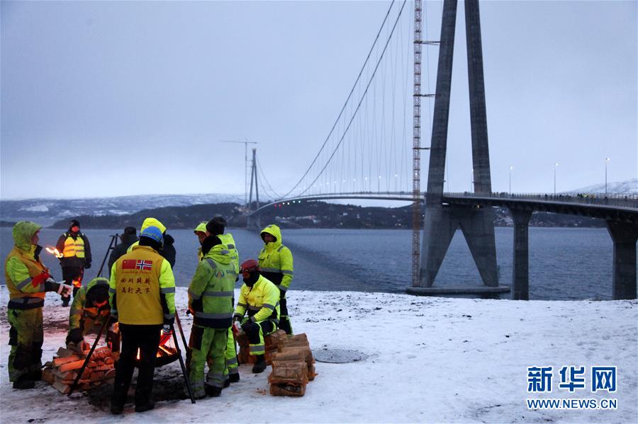 12月9日,中國工人在挪威哈羅格蘭德大橋旁烤火取暖。 新華社記者梁有昶攝