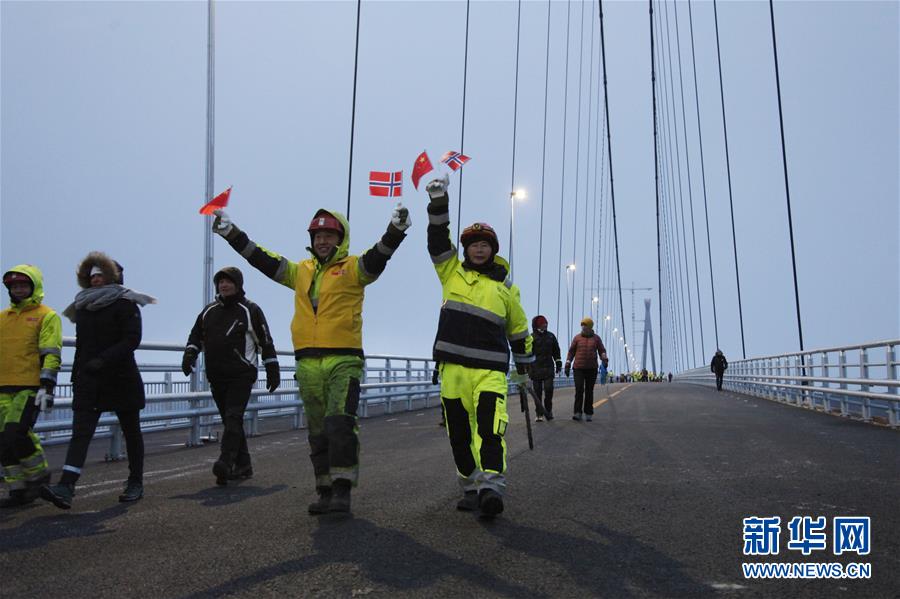 12月9日,中國工人和挪威市民在挪威哈羅格蘭德大橋上行走。 新華社記者梁有昶攝