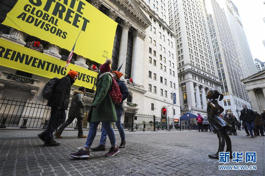 12月10日,在美國紐約,人們從紐約證券交易所前的“無畏女孩”銅像旁走過。 新華社記者 王迎 攝