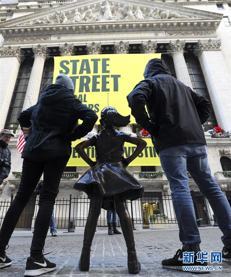 12月10日,在美國(guó)紐約,人們與紐約證券交易所前的“無(wú)畏女孩”銅像合影。 新華社記者 王迎 攝