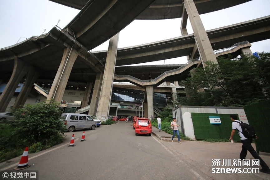 2018年5月29日,重慶,魔幻重慶又雙叒叕放大招!還有一個獨特的亮點,重慶軌道交通3號線銅元局站,出口由一段長梯銜接上方立交橋和下方的路面,與全國最高城市立交橋蘇家壩立交組成了獨特風(fēng)景,許多游客專門趕來拍照。
