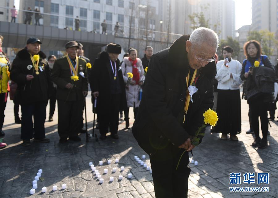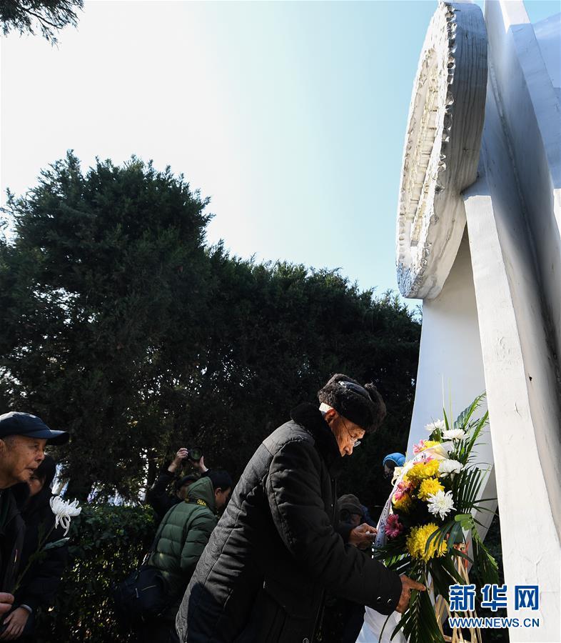12月12日,抗戰(zhàn)老兵在侵華日軍南京大屠殺中山碼頭遇難同胞紀念碑前獻花。 當日,來自湖南、江蘇等地的4名抗戰(zhàn)老兵以及志愿者、南京當?shù)卮髮W生代表等來到侵華日軍南京大屠殺中山碼頭遇難同胞紀念碑前獻花、默哀,祭奠遇難同胞。 新華社記者 季春鵬 攝
