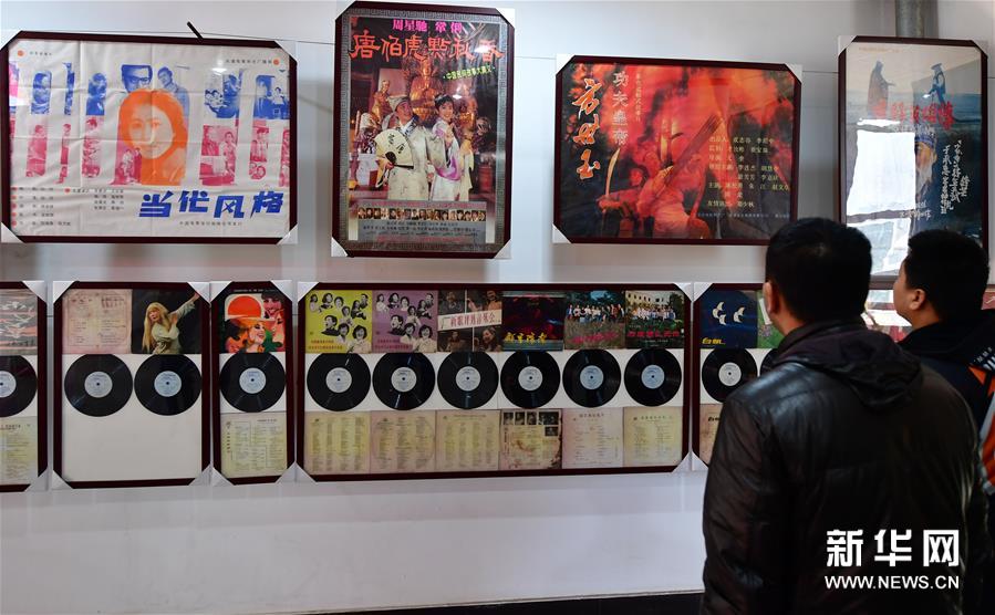 12月12日,觀眾在洛陽(yáng)隋唐百戲城觀看展出的電影海報(bào)與老唱片。新華社記者馮大鵬攝