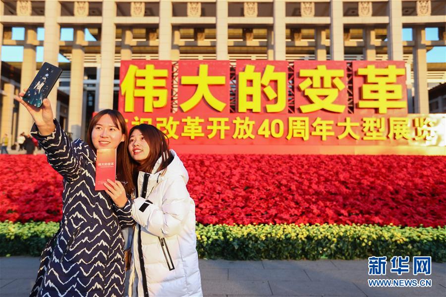 12月18日,參觀者在“偉大的變革——慶祝改革開放40周年大型展覽”外自拍留影。 截至當日,在中國國家博物館舉行的“偉大的變革——慶祝改革開放40周年大型展覽”累計參觀人數(shù)突破160萬人次。 新華社記者 張玉薇 攝