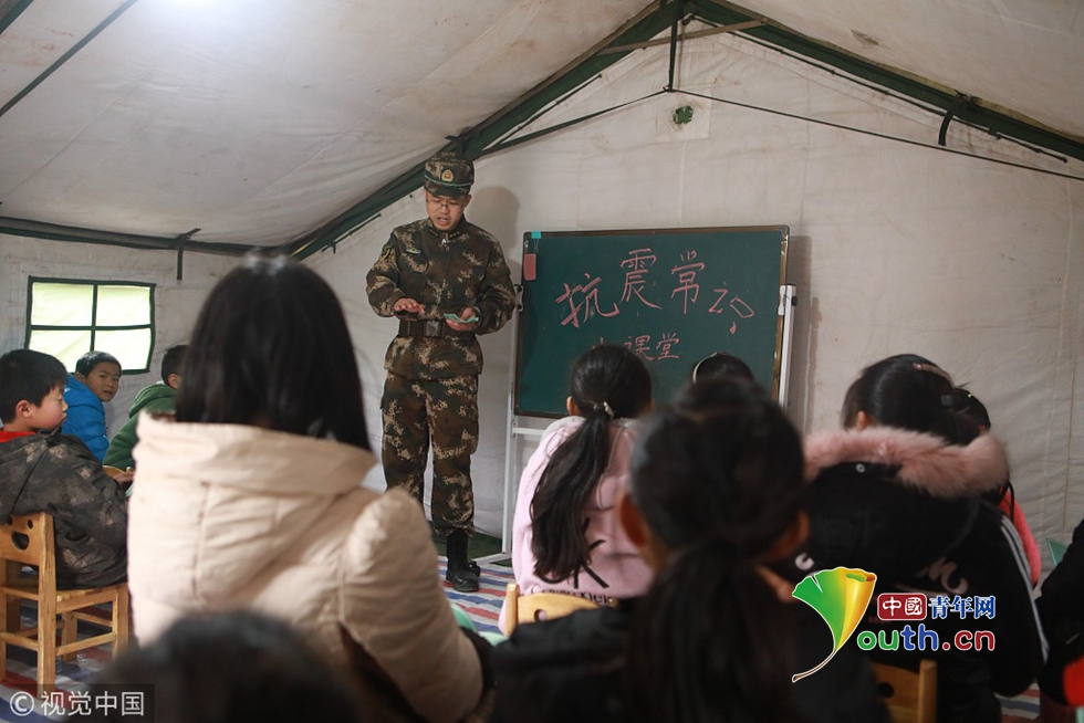 2018年12月18日,四川宜賓。武警宜賓支隊(duì)政治工作處宣傳保衛(wèi)股股長(zhǎng)朵祝偉為周家鎮(zhèn)新塘安置點(diǎn)的“帳篷學(xué)校”的學(xué)生上抗震常識(shí)課。圖片作者:謝江、劉崇達(dá)/視覺中國(guó)