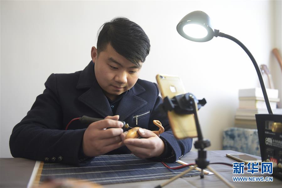 12月18日,劉征在自己的加工坊里通過手機(jī)直播展示葫蘆創(chuàng)作技藝。 新華社記者 魯鵬 攝