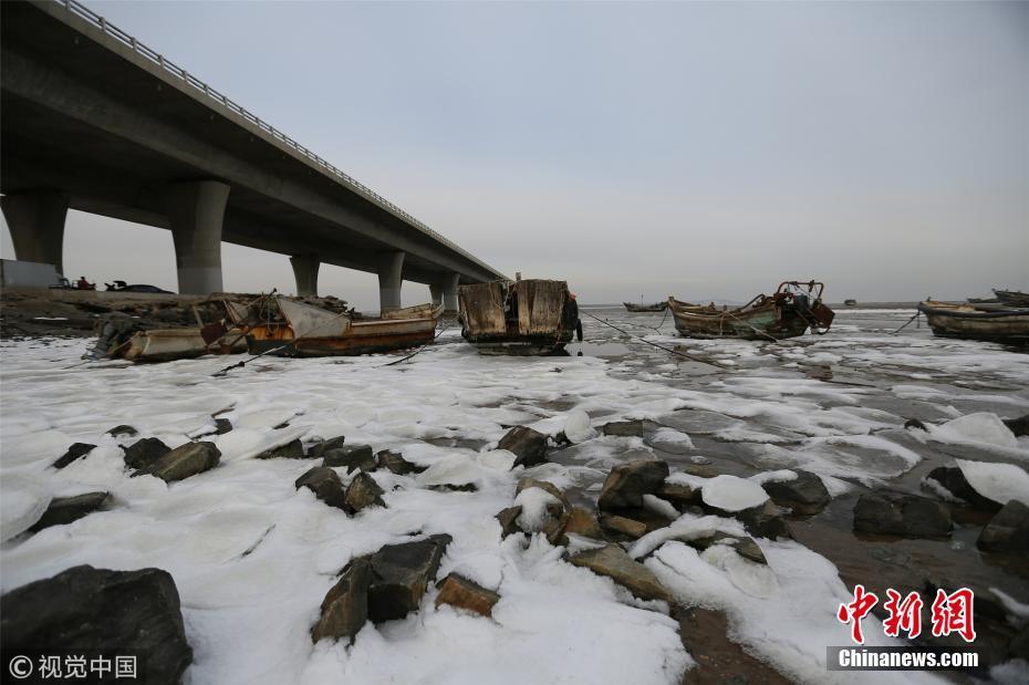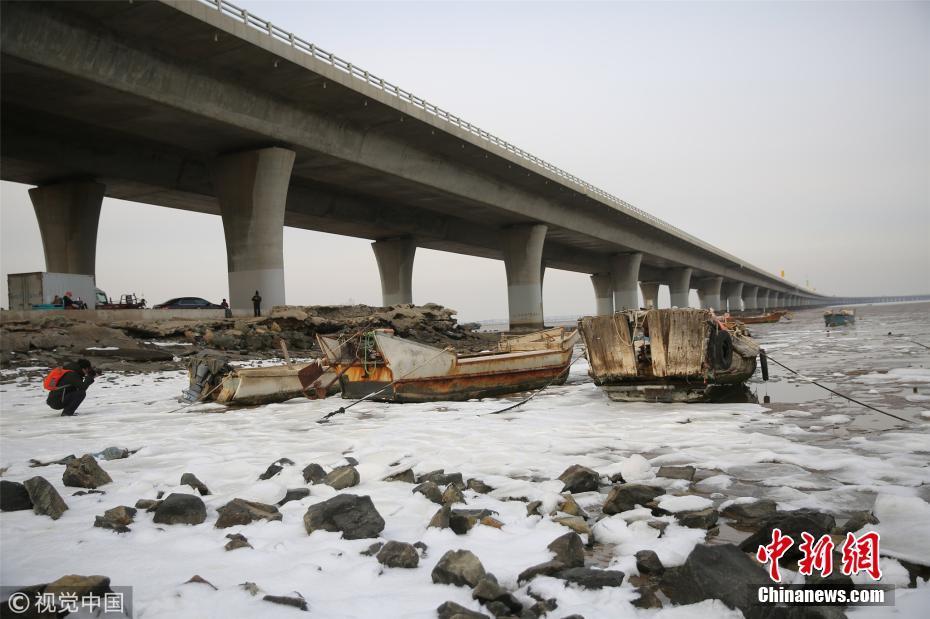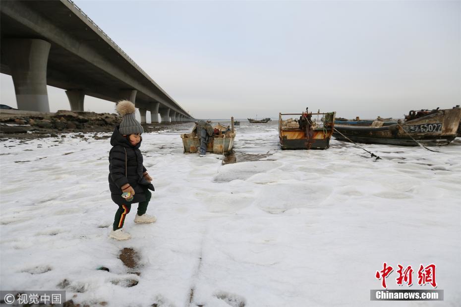 12月9日,受大風(fēng)降溫天氣影響,青島膠州灣北部冰情初現(xiàn),青島西海岸新區(qū)膠州灣跨海大橋入口處海冰層層疊疊,暫未對海上漁業(yè)生產(chǎn)帶來影響。張進剛 攝 圖片來源:視覺中國