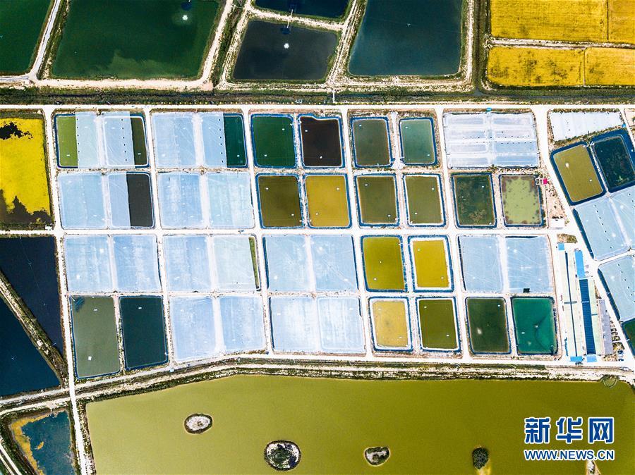 2018年9月11日航拍的寧夏賀蘭縣藍(lán)灣生態(tài)園南美對(duì)蝦養(yǎng)殖基地。 大地之色,俯仰之間;壯美山河,是我的祖國。2018年,新華社記者操縱無人機(jī)“飛閱”華夏大地,在最美的時(shí)節(jié),定格下她的色彩斑斕。 新華社記者 王建華 攝