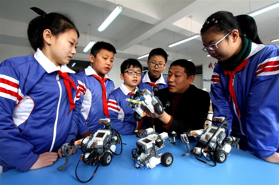 12月19日,武安市淑村鎮(zhèn)白沙學(xué)校的老師給學(xué)生們講解機(jī)器人組裝知識(shí)。 新華社記者王曉攝