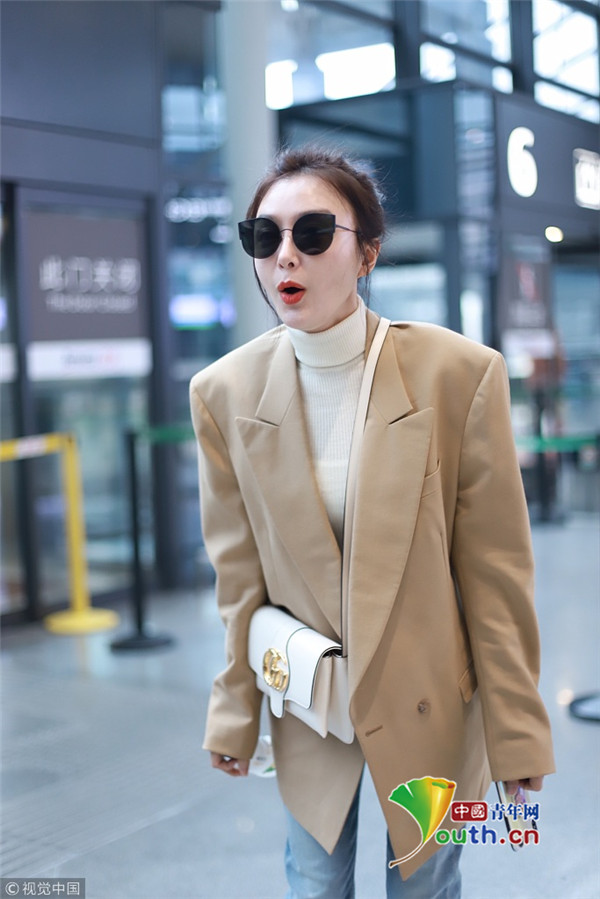 11月29日,上海,秦嵐現(xiàn)身機(jī)場(chǎng)。她戴白色鴨舌帽,穿白色星星圖案外套配微喇牛仔褲,架黑超涂紅唇笑靨如花。