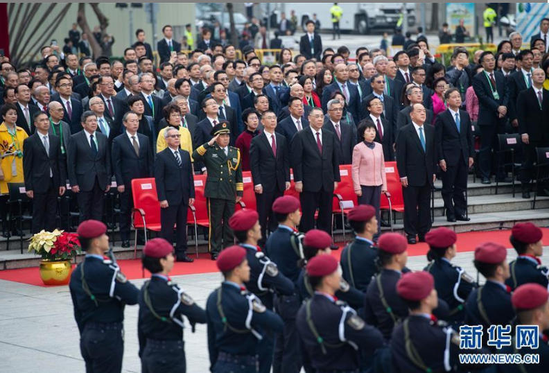 12月20日,澳門(mén)特區(qū)行政長(zhǎng)官崔世安(前右三)、中央人民政府駐澳門(mén)聯(lián)絡(luò)辦公室副主任姚堅(jiān)(前左三)、外交部駐澳門(mén)特別行政區(qū)特派員公署特派員沈蓓莉(前右二)等出席升旗儀式。新華社記者 張金加 攝