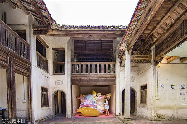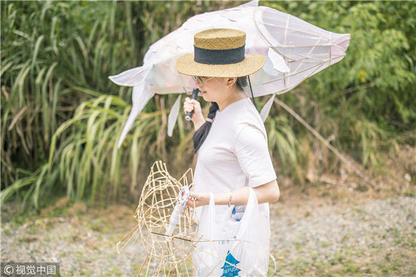 2018年8月10日,廣東揭陽,溫秋雯把獅子頭扒得只剩下骨架和包布,之后將不同顏色的紙片裁剪成三角形、鱗片形等不同形狀,作為裝飾獅子的皮毛,粘在獅子身上,獅子的鼻子則是用彩紙條以手鞠的方式纏繞而成,在獅頭內(nèi)部安裝了一盞白熾燈,一打開電燈,萌態(tài)可掬的獅子便呈現(xiàn)在人們眼前。紙片的顏色以淡粉、淡綠、淺白色為主,就這樣,人們平時印象中威猛的南獅,被改裝得萌萌的。圖為2018年8月10日,廣東省梅州市,溫秋雯和她的紙雕作品。