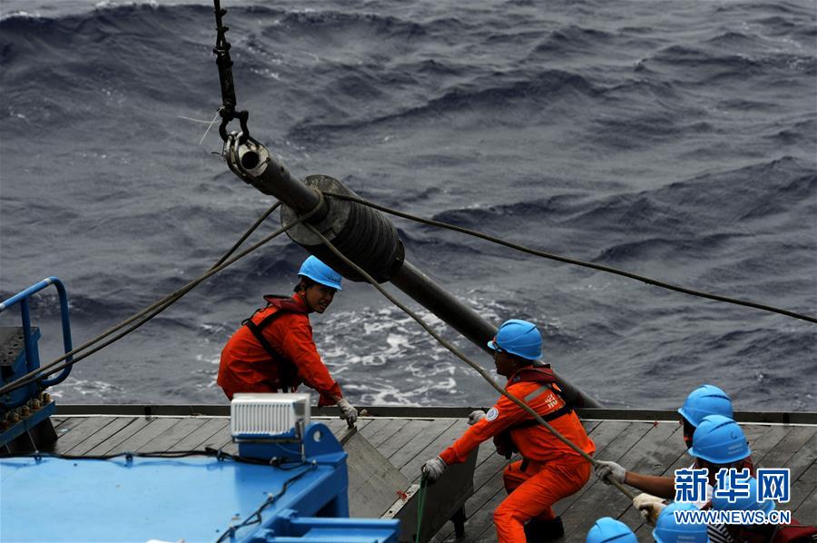 科考團(tuán)隊成員在船上布放重力柱(12月21日攝)。