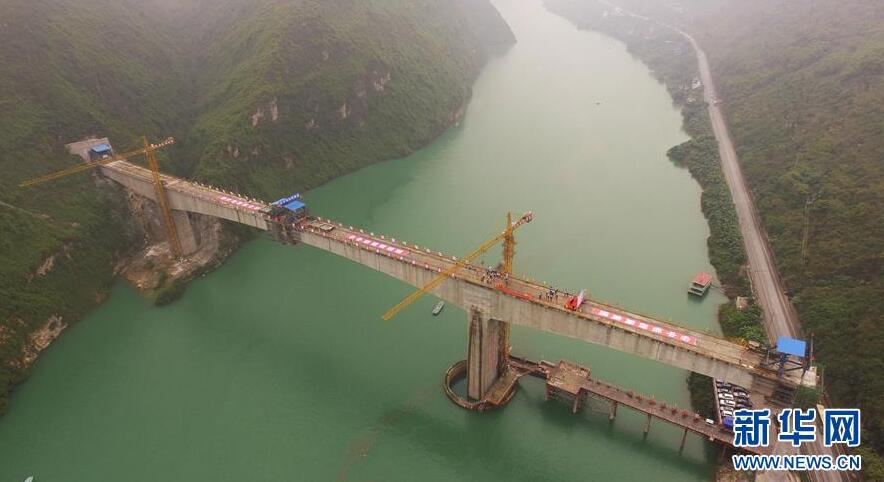 在重慶涪陵拍攝的渝懷鐵路涪秀二線重點工程——烏江右線大橋(10月23日無人機拍攝)。10月23日,由中鐵四局承建的渝懷鐵路涪秀二線重點工程——烏江右線大橋主跨成功合龍,標志著大橋主體工程全部順利結(jié)束。烏江右線大橋項目全程460.1米,主跨192米,跨越烏江和319國道。在兩年多的建設過程中,施工人員攻克了“不等高墩”“不對稱邊跨”“邊跨入隧”等多個技術(shù)難題。新華社記者王全超攝