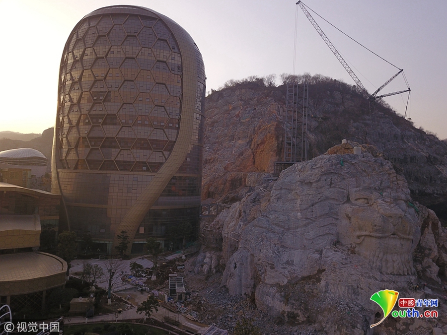 廢棄工地建蜂巢酒店 百名工人用時(shí)半年雕出巨型山體石獅