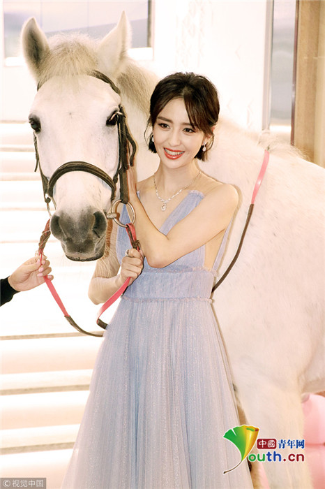 佟麗婭穿淡藍紗裙 與白馬合照甜美迷人仙氣十足