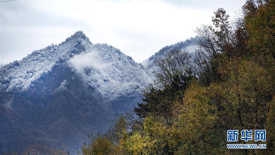 鬼谷嶺國(guó)家森林公園山頂白雪覆蓋,半山卻是一派秋色(11月8日拍攝)。 新華社記者陶明攝