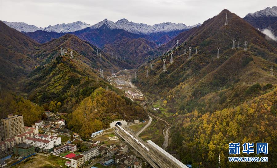 11月5日,一列動(dòng)車從陜西省漢中市佛坪站駛過(guò)(無(wú)人機(jī)拍攝)。 新華社記者陶明攝