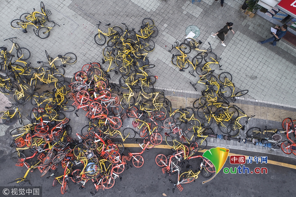 2018年11月9日,深圳落戶(hù)。城中村口,路邊堆積的共享單車(chē)。
