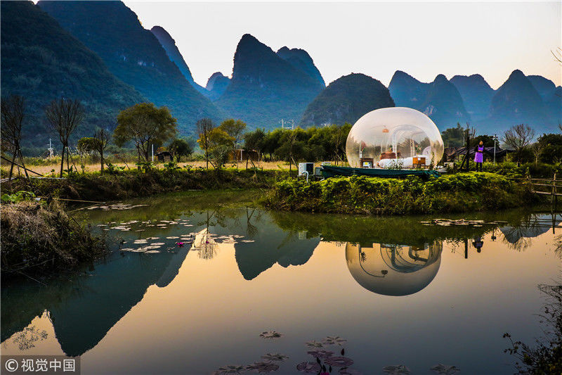 但是很多民宿都藏在深山或者海邊,并不好尋其蹤跡,接下來(lái)小編我就給大家推薦了幾家最美的民宿,大家在欣賞的同時(shí),都可以拿小本本記下來(lái),等有空大家可以一一打卡一遍。圖為2018年12月17日,廣西桂林,陽(yáng)朔縣遇龍河畔。夜色中的泡泡屋。