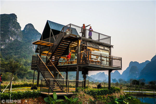 2018年12月17日,廣西桂林,陽朔縣遇龍河畔。黃昏時分,游客站在觀景臺觀賞泡泡屋及周邊景觀。