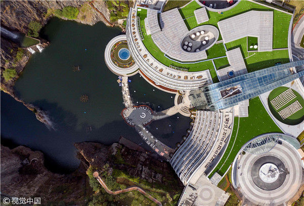 另外,大堂內(nèi)有一根動(dòng)態(tài)水幕,自下而上直通屋頂,水幕是根據(jù)深坑的景色變化、巖層變化而安排的設(shè)計(jì)故事體驗(yàn)。