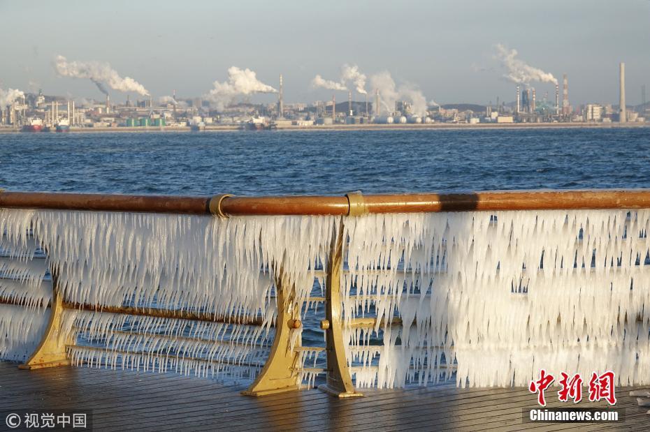 渤海海水在北風(fēng)的作用下涌向岸邊,在大連東港海岸護(hù)欄上凝結(jié)成冰凌,形成約有兩公里的冰凌奇觀。圖為大連市東港海岸護(hù)欄結(jié)滿晶瑩剔透的冰棱。圖片來源:視覺中國