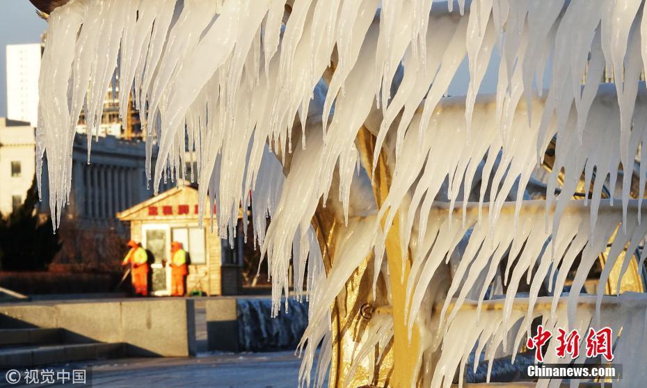 渤海海水在北風(fēng)的作用下涌向岸邊,在大連東港海岸護(hù)欄上凝結(jié)成冰凌,形成約有兩公里的冰凌奇觀。圖為大連市東港海岸護(hù)欄結(jié)滿晶瑩剔透的冰棱。圖片來源:視覺中國