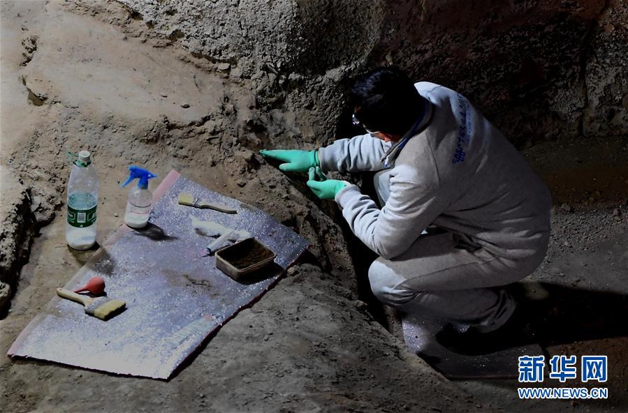 在河南鄭州大河村遺址博物館,科研人員在對仰韶文化房基進行體檢、加固(12月11日攝)。