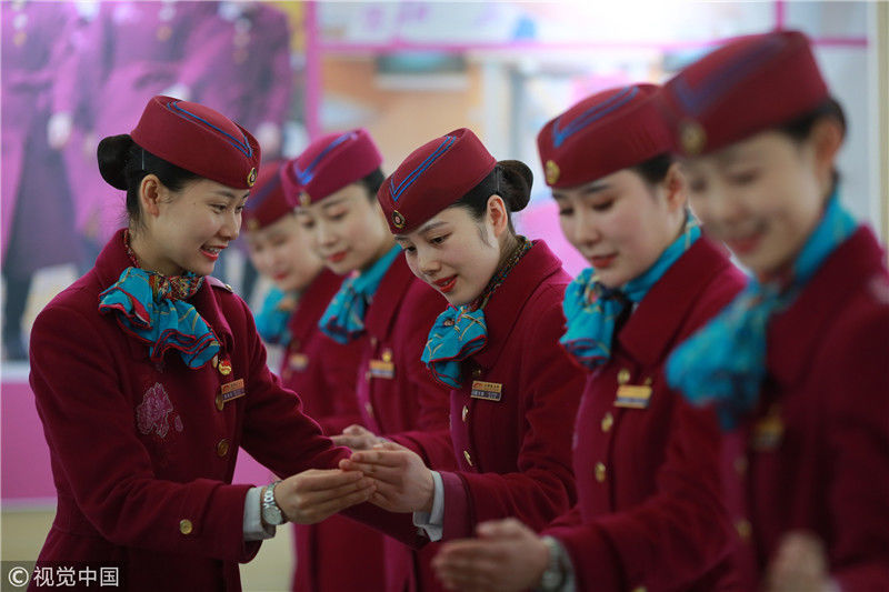2018年12月27日,四川成都,為備戰(zhàn)即將開通的成雅鐵路,中國(guó)鐵路成都局集團(tuán)有限公司成都客運(yùn)段動(dòng)車二隊(duì)對(duì)成雅動(dòng)車的乘務(wù)人員進(jìn)行理論、形體、服務(wù)禮儀等內(nèi)容的培訓(xùn)。