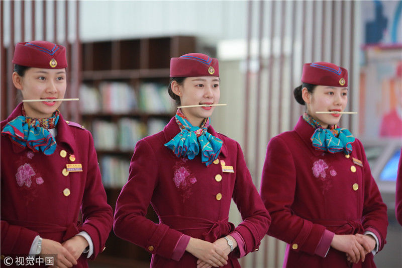 2018年12月27日,四川成都,為備戰(zhàn)即將開通的成雅鐵路,中國鐵路成都局集團(tuán)有限公司成都客運(yùn)段動(dòng)車二隊(duì)對(duì)成雅動(dòng)車的乘務(wù)人員進(jìn)行理論、形體、服務(wù)禮儀等內(nèi)容的培訓(xùn)。