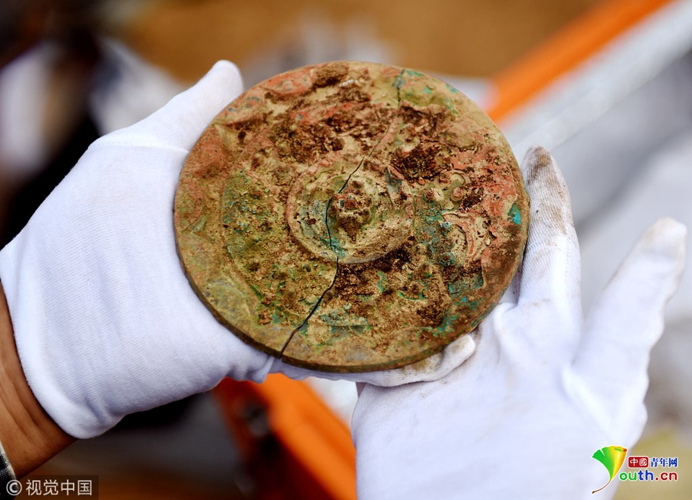 這是發(fā)掘的隨葬“搖錢樹”底座(11月15日攝)。