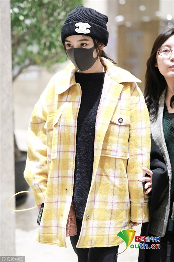 2018年1月6日,上海,楊冪現(xiàn)身某酒店。她戴著帽子口罩,身穿黑色套裝,而外面搭配的奶黃格子外套卻瞬間減齡,明亮又惹眼,無懼寒冬露著纖細腳踝,依舊是那個很會穿搭的大冪冪。