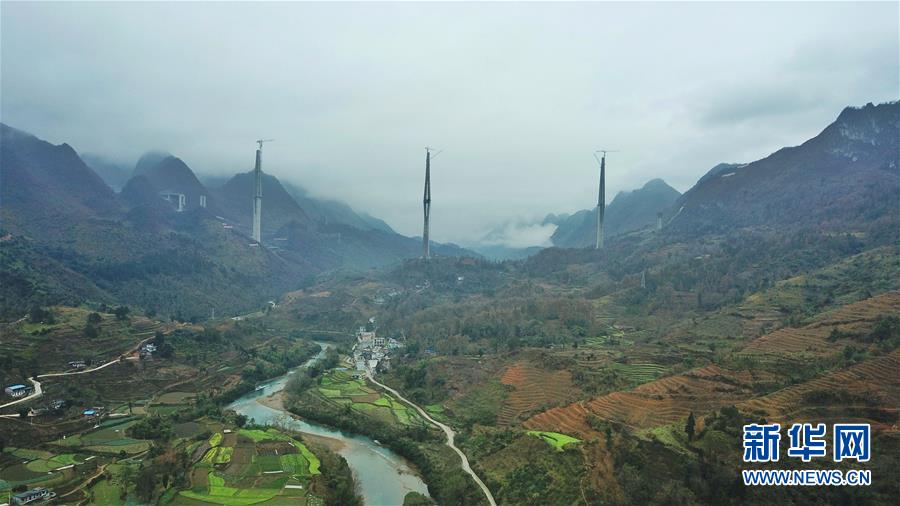 1月7日無人機(jī)航拍的平塘特大橋橋塔全景,中為高332米的世界第一高混凝土橋塔。