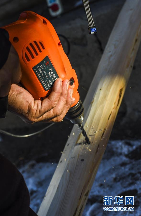 在新疆布爾津縣禾木村的一處冬季牧場(chǎng),森格爾在制作毛皮滑雪板時(shí)在木材上鉆孔(1月3日攝)。新華社記者 胡虎虎 攝