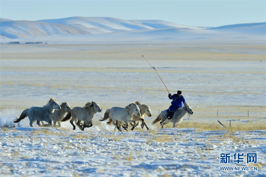 1月8日,牧民進行套馬表演。 時下正值草原冬季旅游旺季,內蒙古自治區(qū)西烏珠穆沁旗的牧民們在雪原上一展身手,為游客展現獨特的民族風情。 新華社記者 鄒予 攝