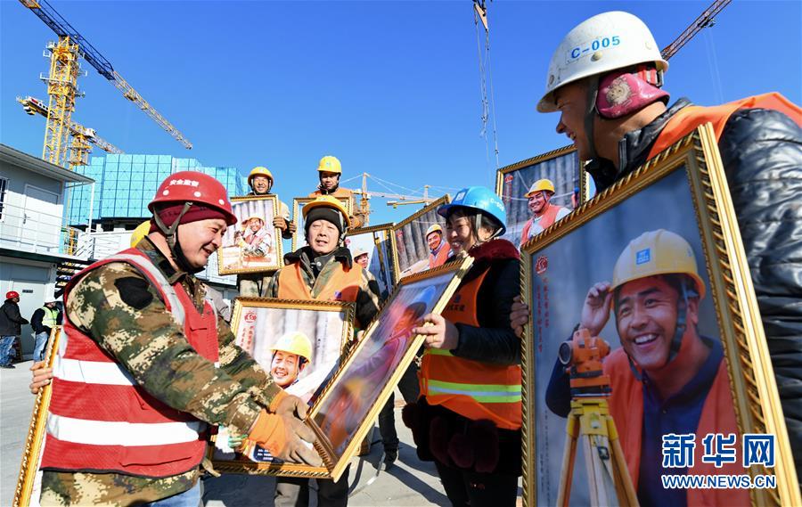 1月9日,中建一局北京城市副中心周轉房項目工地的工人在觀看自己的照片。 當日,由北京市總工會主辦的工會“兩節(jié)”送溫暖活動之一的“把微笑帶回家,為最美勞動者點贊”大型公益活動,在中建一局北京城市副中心職工周轉房項目工地舉行。眾多勞動者獲贈“微笑”肖像照和保溫壺、毛巾等新春“大福包”。 新華社記者 李欣 攝