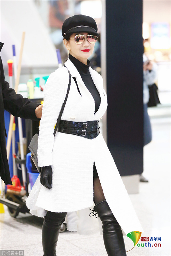 1月10日,廣東省深圳市,趙雅芝夫婦現(xiàn)身深圳寶安機(jī)場(chǎng),頭戴貝雷帽的她架著反光墨鏡,一襲白色不規(guī)則連衣裙配上黑色腰封及皮靴,酷似甜美女教官!