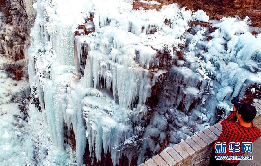 近日,河北省涉縣太行五指山景區(qū)出現(xiàn)冰瀑景觀,吸引眾多游客到此觀賞。