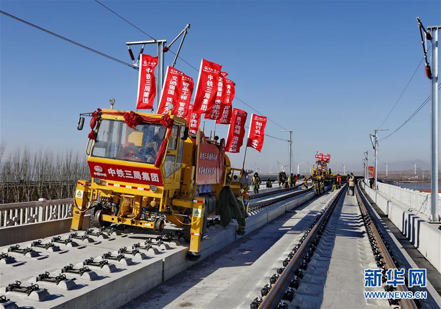 1月13日,中鐵三局的工人在京張高鐵官廳水庫特大橋進行鋪軌作業(yè)。 新華社記者 楊世堯 攝