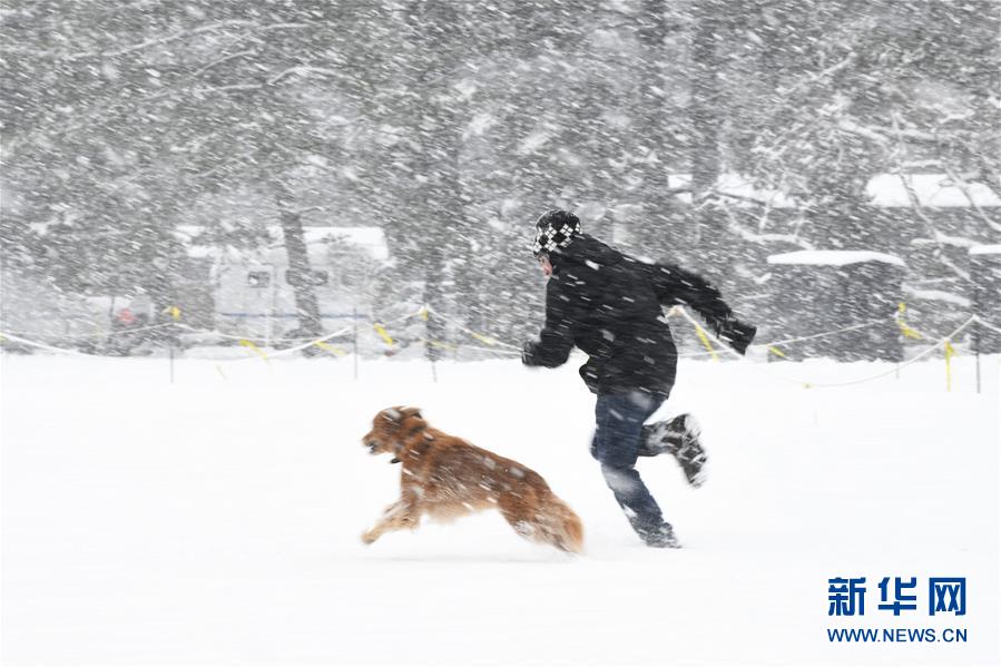 1月13日,在美國(guó)首都華盛頓,一名男子與寵物狗在林肯紀(jì)念堂旁玩耍。 近日,美國(guó)首都華盛頓及其周邊地區(qū)普降暴雪。降雪導(dǎo)致部分航班晚點(diǎn)或取消,道路交通事故增多。 新華社記者 劉杰 攝