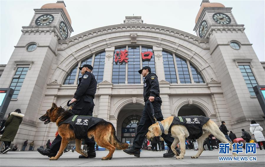 1月15日,訓導員帶著警犬“皮特”(右)和“哼哼”在漢口火車站熟悉春運執(zhí)勤場地。