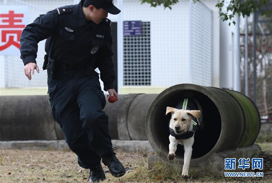 1月15日,警犬“皮特”在訓導員丁巖的帶領下進行崗前特訓。新華社記者 程敏 攝