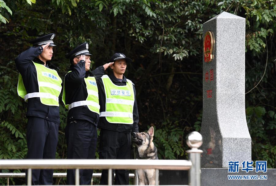 鐵路公安民警陸日峰(左二)和同事在中越邊境巡線時向界碑敬禮(2018年12月31日攝)。 新華社記者陸波岸攝