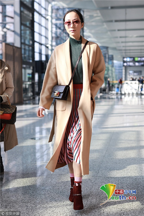 2019年1月17日,上海,韓雪現(xiàn)身機場,穿著條紋紗裙露出小腿,十分抗凍,她搭配經(jīng)典的駝色大衣,氣質(zhì)出眾在機場人群中相當搶鏡。