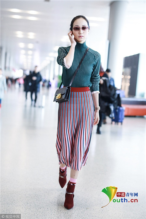 2019年1月17日,上海,韓雪現(xiàn)身機場,穿著條紋紗裙露出小腿,十分抗凍,她搭配經典的駝色大衣,氣質出眾在機場人群中相當搶鏡。