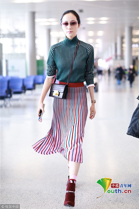 2019年1月17日,上海,韓雪現(xiàn)身機場,穿著條紋紗裙露出小腿,十分抗凍,她搭配經(jīng)典的駝色大衣,氣質(zhì)出眾在機場人群中相當(dāng)搶鏡。