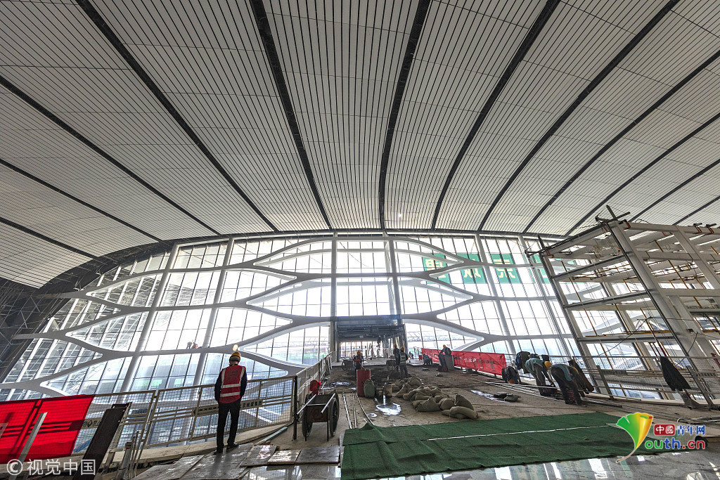 2018年12月19日,北京大興國際機場航站樓的室內裝修場景。視覺中國